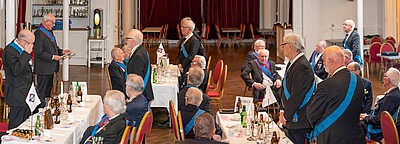 Vid måltidens början hälsar OG alla välkomna samt tackar för att de tagit sig tid att närvara vid Gradgivning och Parentation och för den insamlade kollekten, SEK 1.201. Han påminner om 125-årsjubileet som kommer att hållas 26 oktober på La Venue.