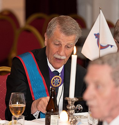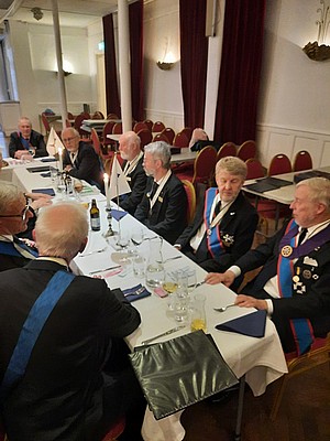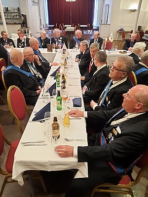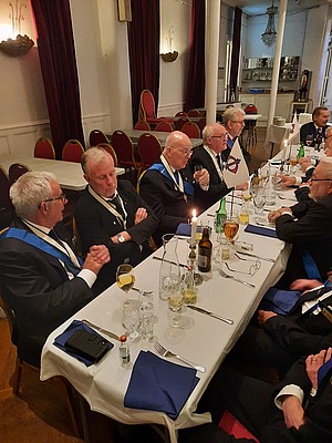 Vid måltidens början hälsar OG alla välkomna samt tackar för att de tagit sig tid att närvara vid Gradgivning och Parentation och för den insamlade kollekten, SEK 1.201. Han påminner om 125-årsjubileet som kommer att hållas 26 oktober på La Venue.
